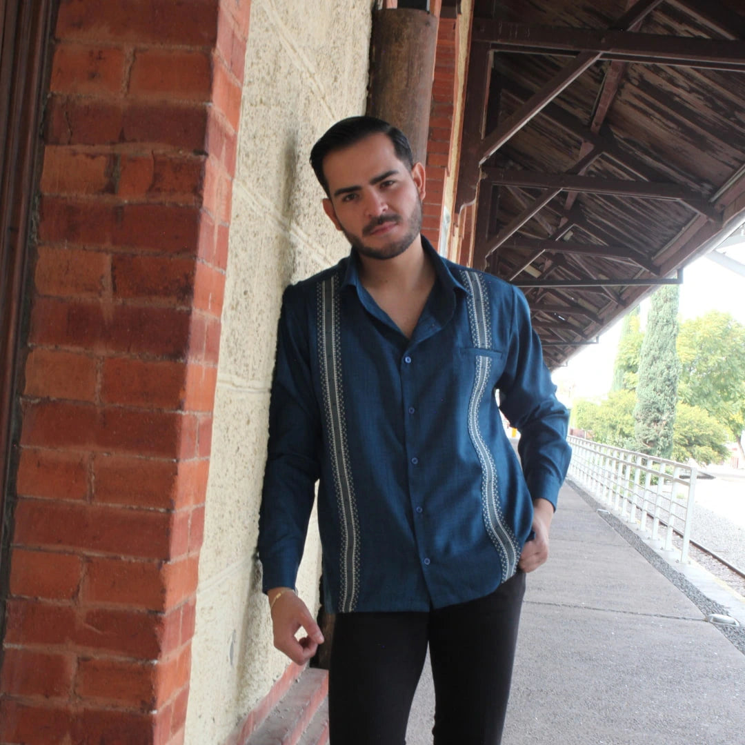 Camisa Guayabera Bordada Azul Petroleo Manga Larga