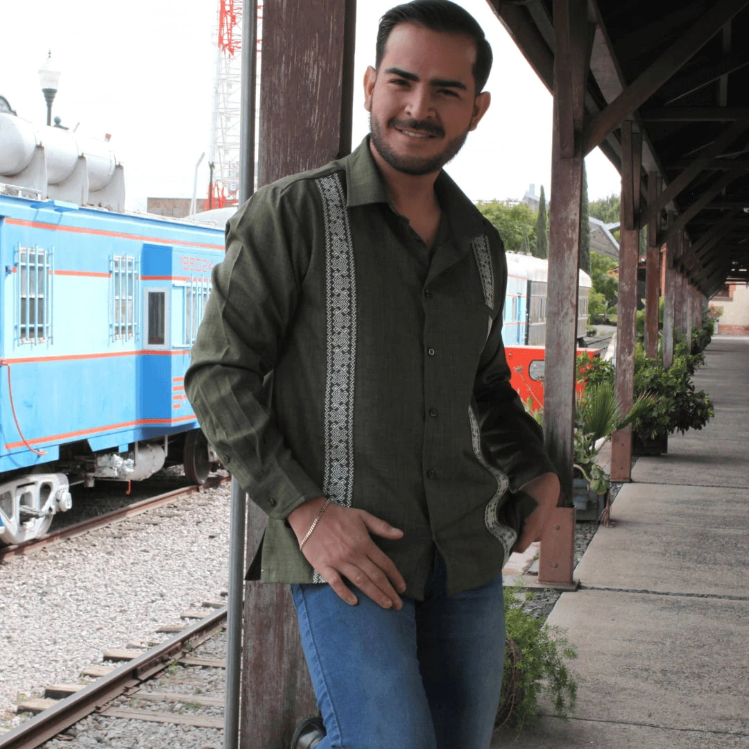 Camisa Guayabera Bordada Verde Olivo Manga Larga