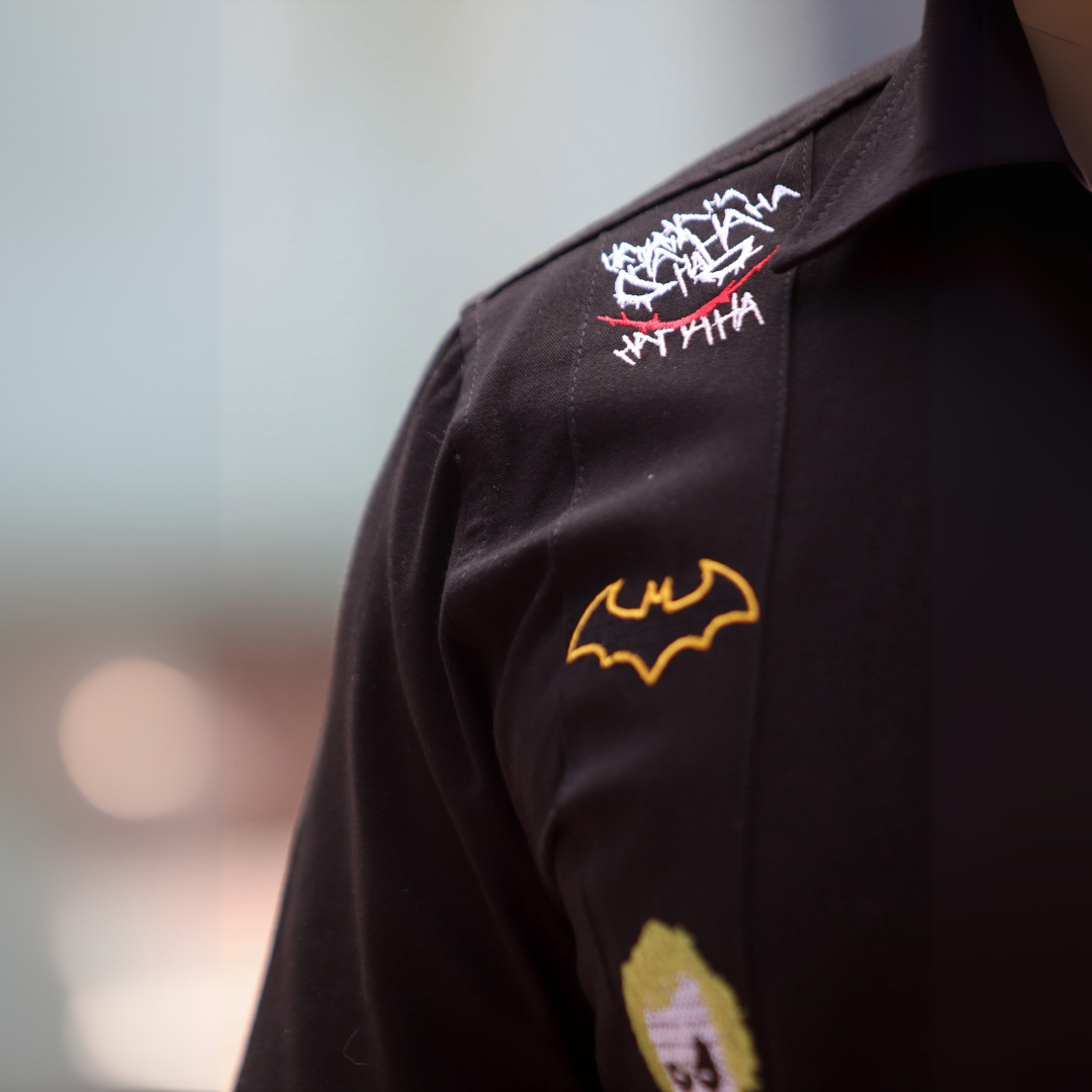 Algodón 100% de alta calidad, esta camisa negra de manga corta combina frescura, comodidad y un diseño audaz. Inspirada en el mundo de los héroes y villanos más iconos de la cultura urbana, presenta bordados detallados que evocan la escancia del justiciero enmascarado, un payaso caótico y un personaje de doble moral.
