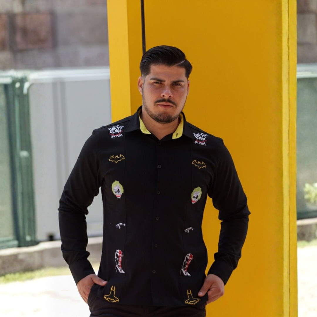 Algodón 100% de alta calidad, esta camisa negra de manga larga combina frescura, comodidad y un diseño audaz. Inspirada en el mundo de los héroes y villanos más iconos de la cultura urbana, presenta bordados detallados que evocan la escancia del justiciero enmascarado, un payaso caótico y un personaje de doble moral.